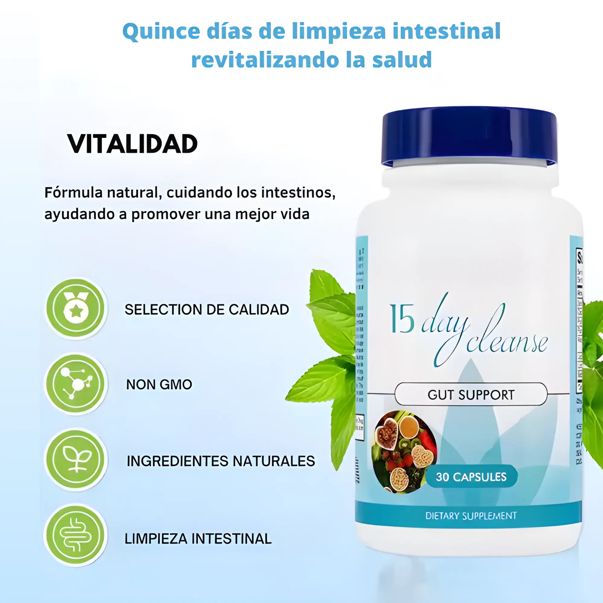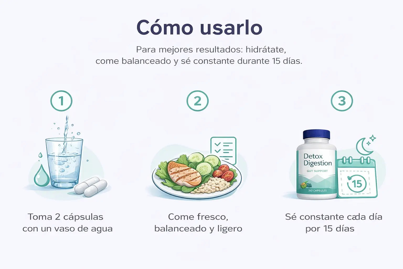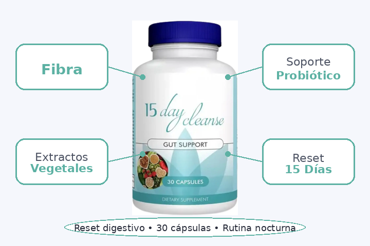 Toma 2 cápsulas al día con un vaso grande de agua. Tip clave: hidrátate bien para un mejor confort digestivo.